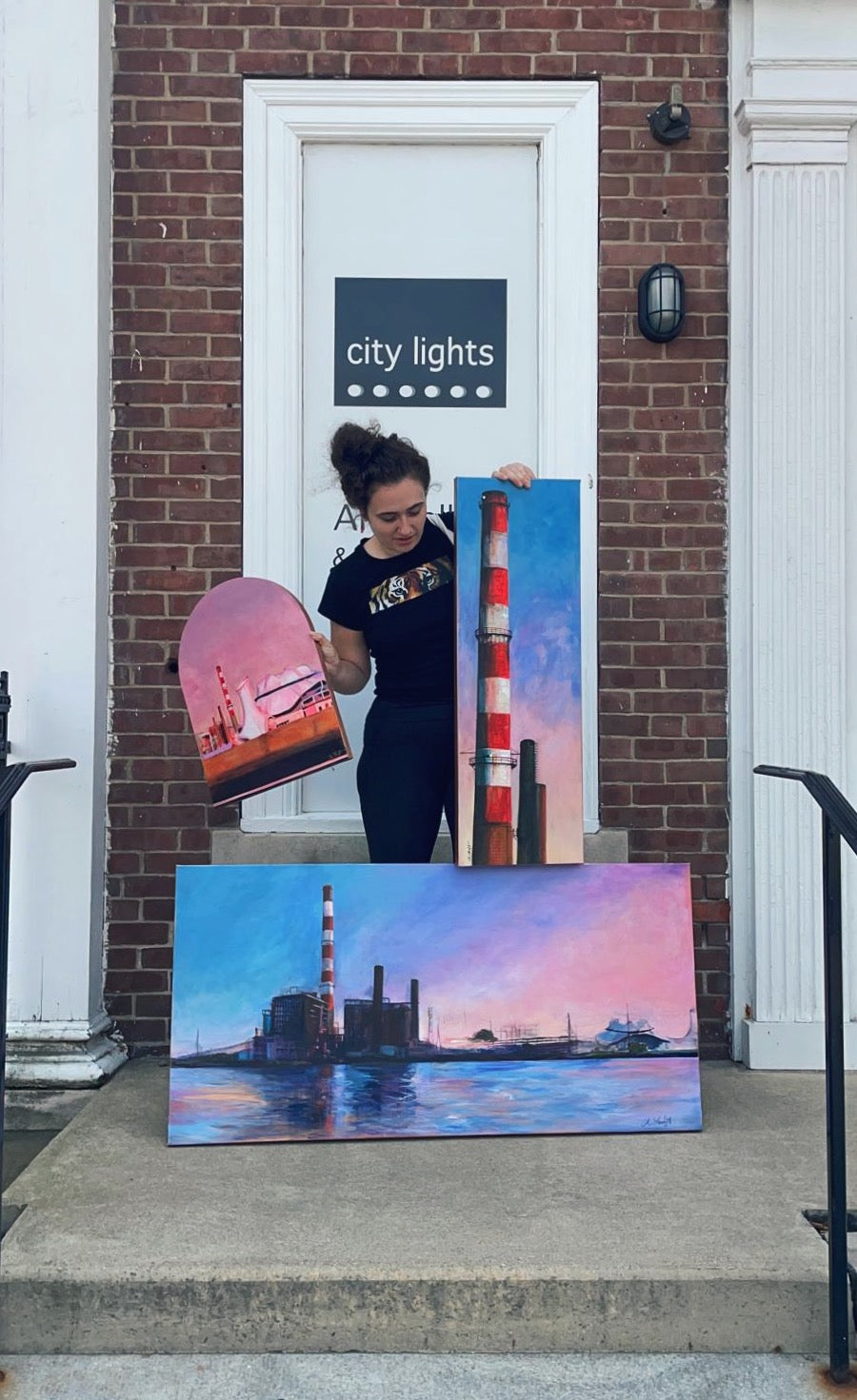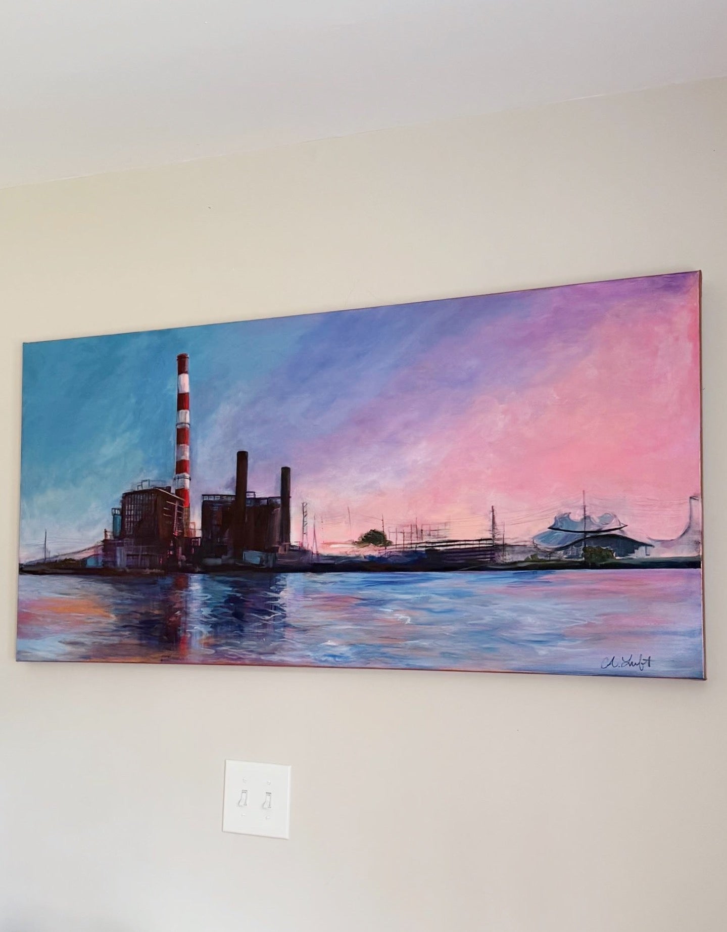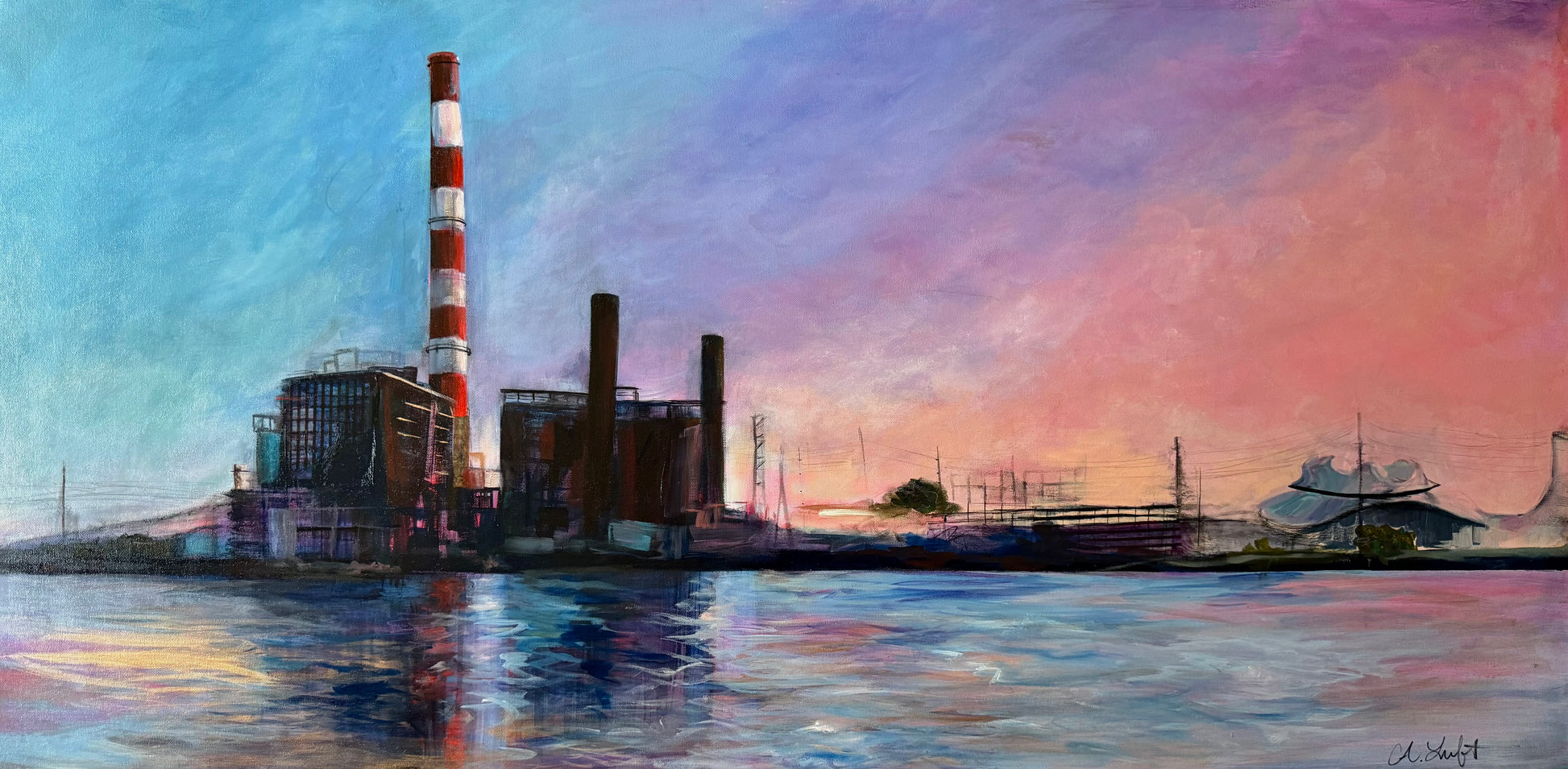 This mixed media expression of the iconic Bridgeport Smokestacks reflects both an ending and a new beginning. As the structure faces demolition, the dusty blue, lavender, and pink sunset sky transforms the industrial skyline into a luminous, hopeful, reflective glow. Painted on a strikingly bold 48x24 inch canvas and finished with metallic bronzy rose edges, this work of art arrives varnished and ready to hang.